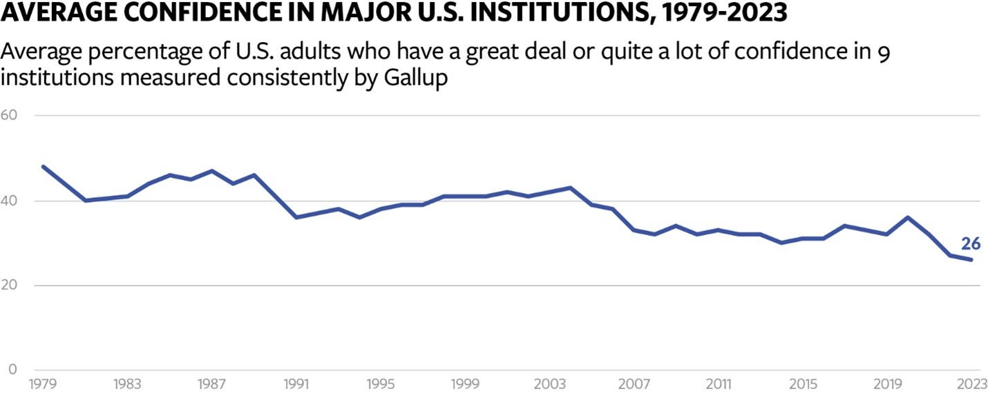 I don’t think this decline in trust will be easily reversed. Carpenter’s book was published while powerful forces were changing the nature of how trust and reputation were earned and maintained. Beyond the specific missteps and oversights the agency made, I see these more fundamental forces as the key driver of FDA’s decline and its current predicament. As the author Martin Gurri describes, while governments and elites once held a monopoly over information, that is no longer the case. Instead, the public must contend with a “tsunami” of information driven by modern media and the internet. Some of that information is inaccurate: falsehoods, conspiracy theories, misinformation, and the like. Some of it is accurate but unflattering; the failures of elite institutions like FDA are simply far more visible to the public than they once were. This tsunami has brought down trust in institutions across society, and this collapse in trust goes much further than just the FDA.